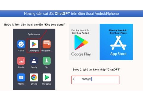 Hướng dẫn cài đặt ChatGPT trên điện thoại Android/Iphone Bước 1: Trên điện thoại, tìm đến “Kho ứng dụng” Bước 2: tại ô tìm kiếm nhập “ChatGPT”