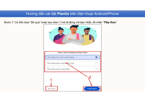 Hướng dẫn cài đặt Plantix trên điện thoại Android/iPhone Bước 7: Có thể chọn “Bỏ qua” hoặc lựa chọn 1 mô tả đúng với bạn nhất, rồi nhấn “Tiếp theo”